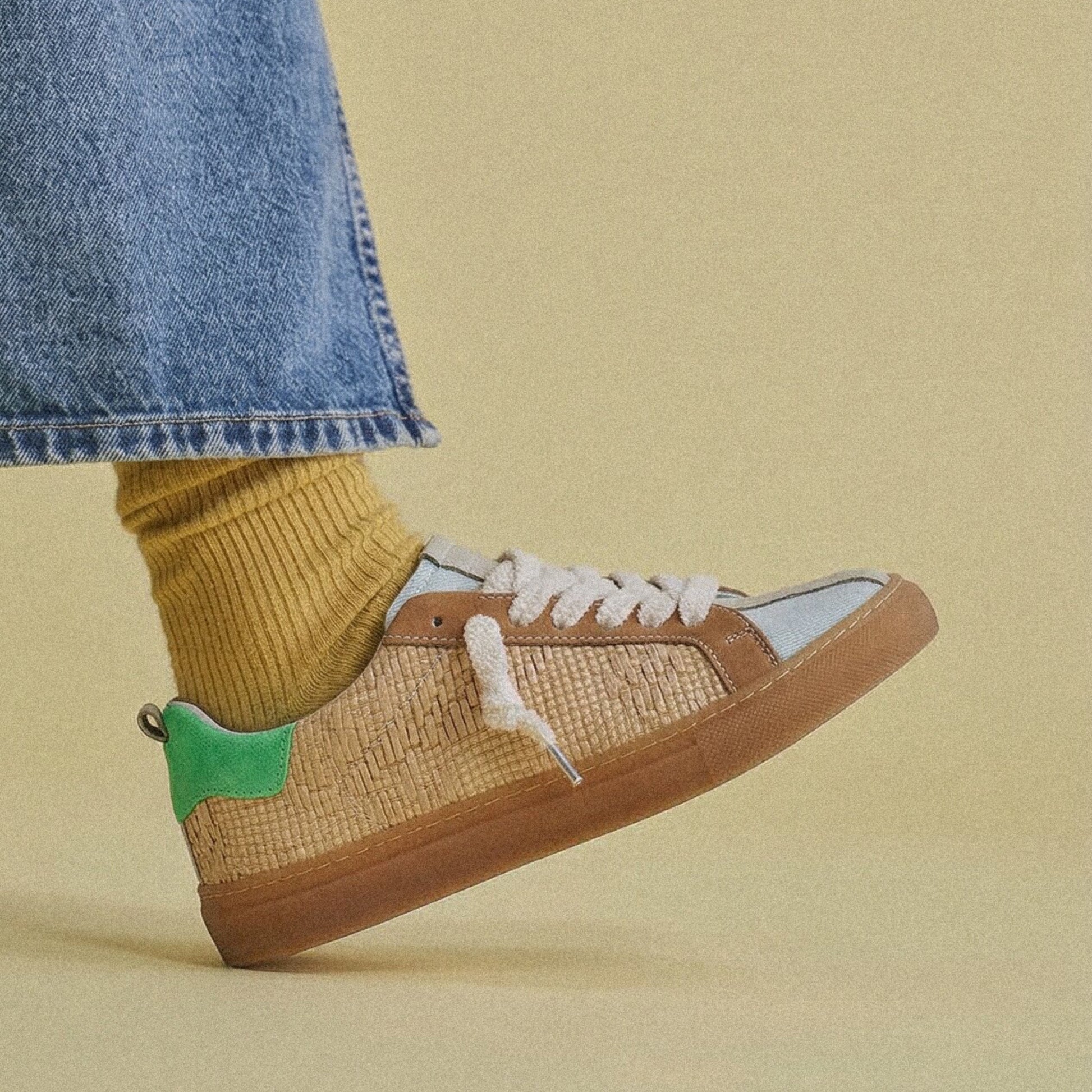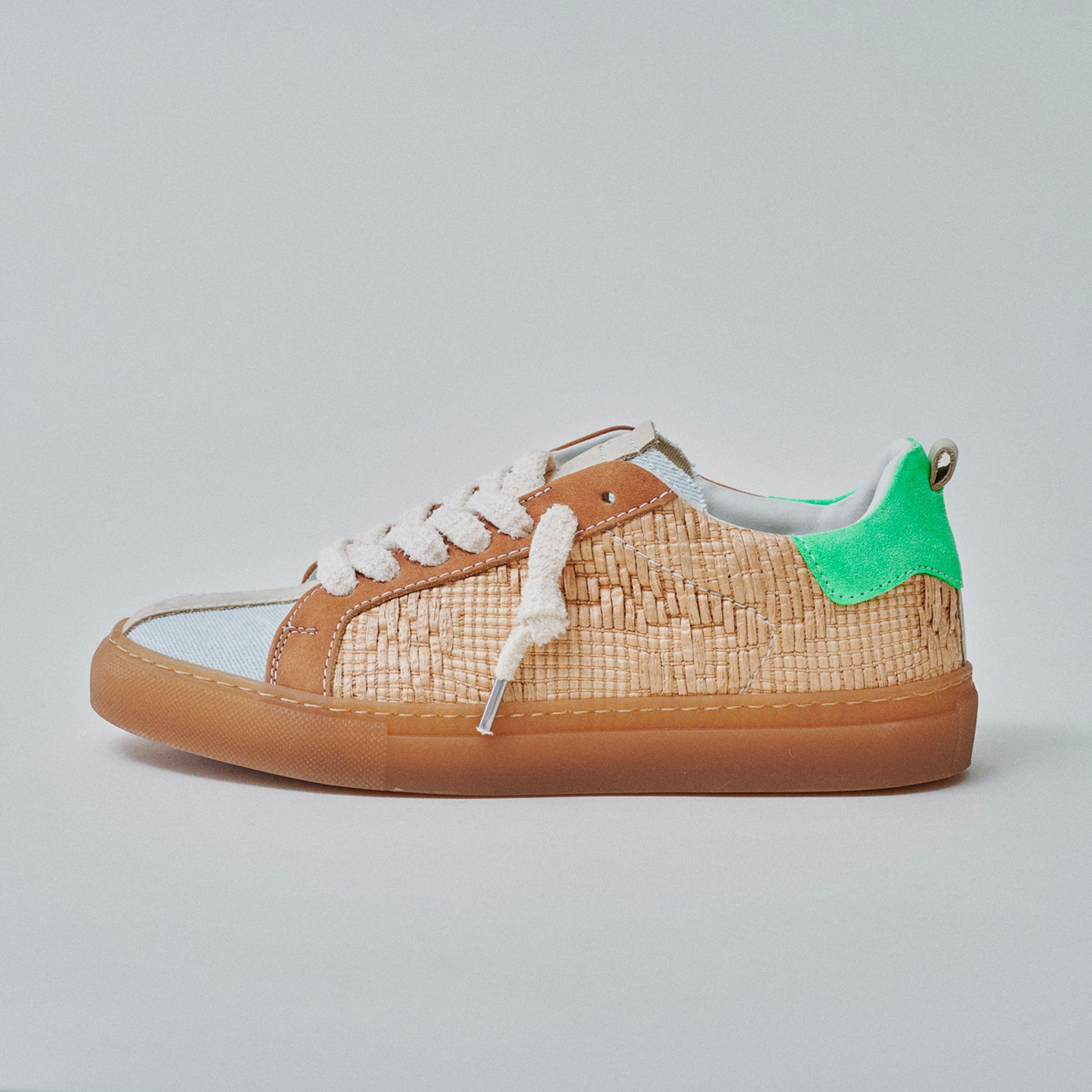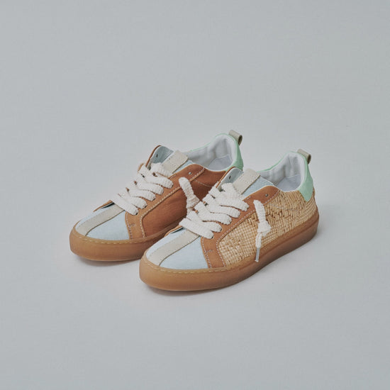 Unisex low-top sneaker with raffia and denim upper, TR sole, terry cloth laces, cream cotton second lace, and terry cloth and leather lining. Handmade in an Italian artisan workshop.