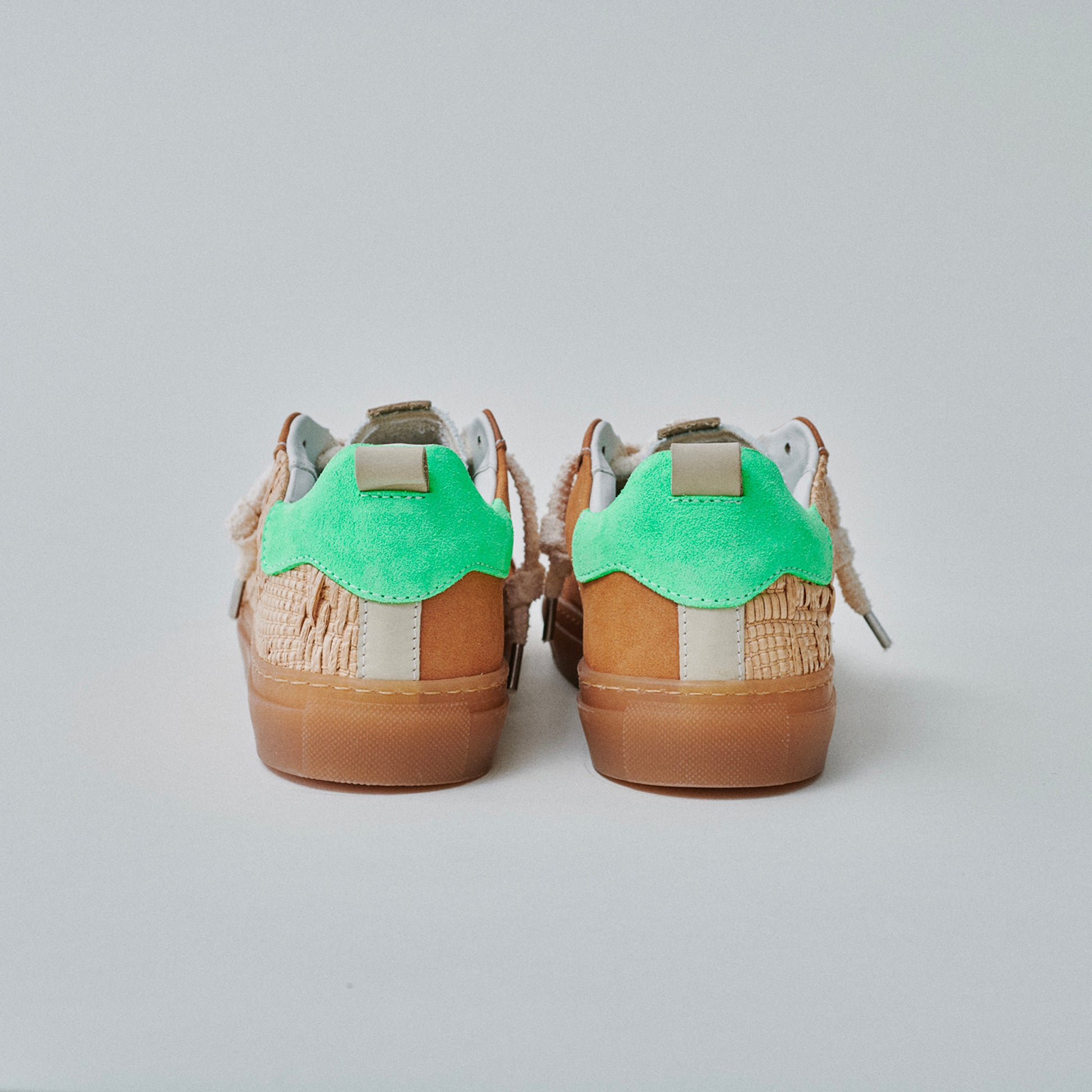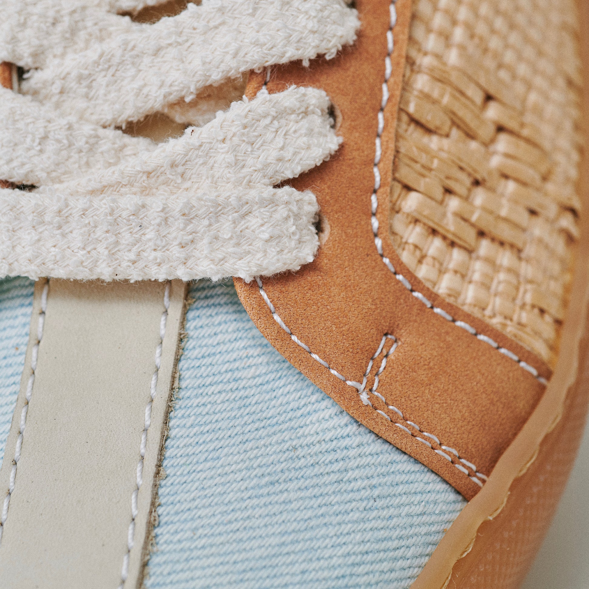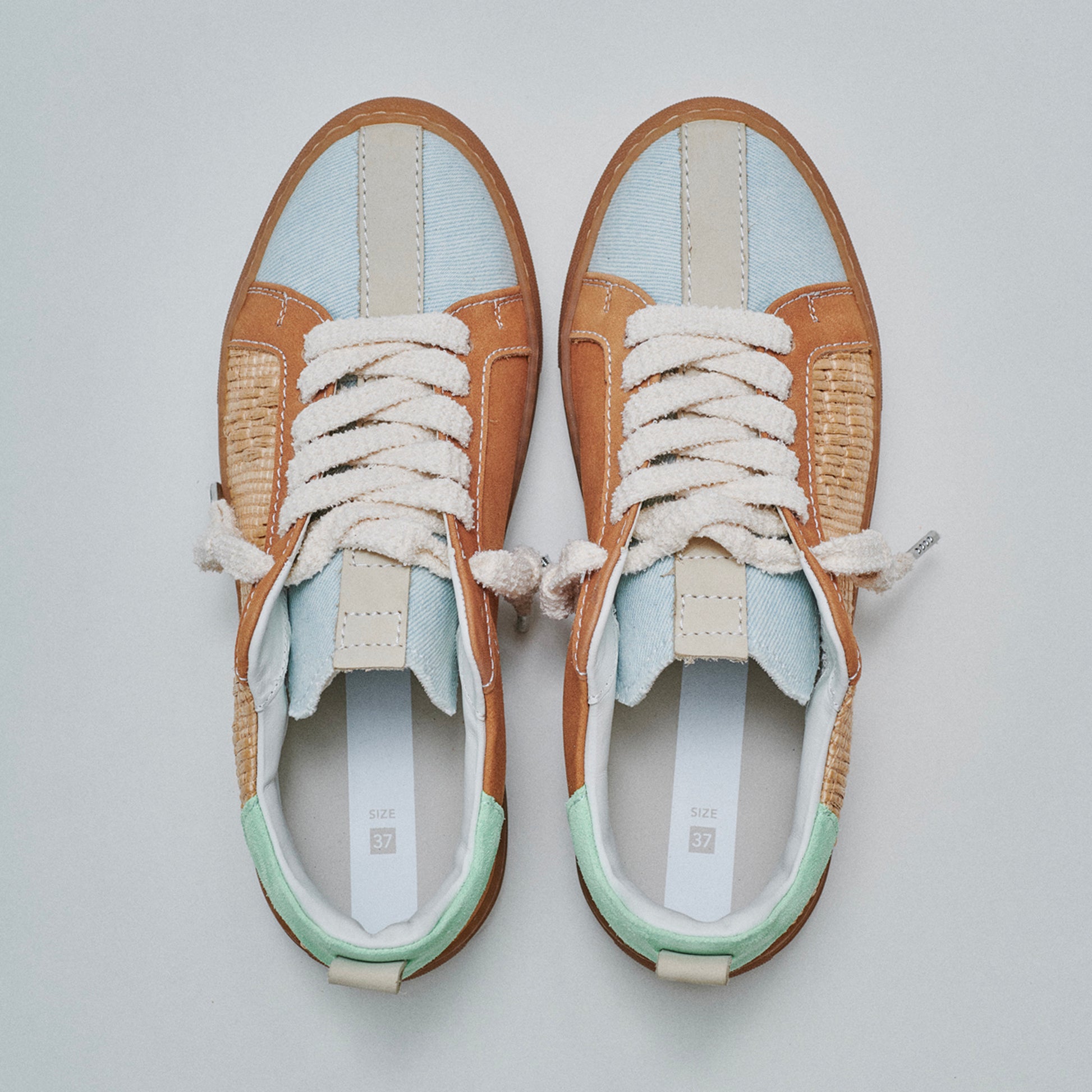 Unisex low-top sneaker with raffia and denim upper, TR sole, terry cloth laces, cream cotton second lace, and terry cloth and leather lining. Handmade in an Italian artisan workshop.