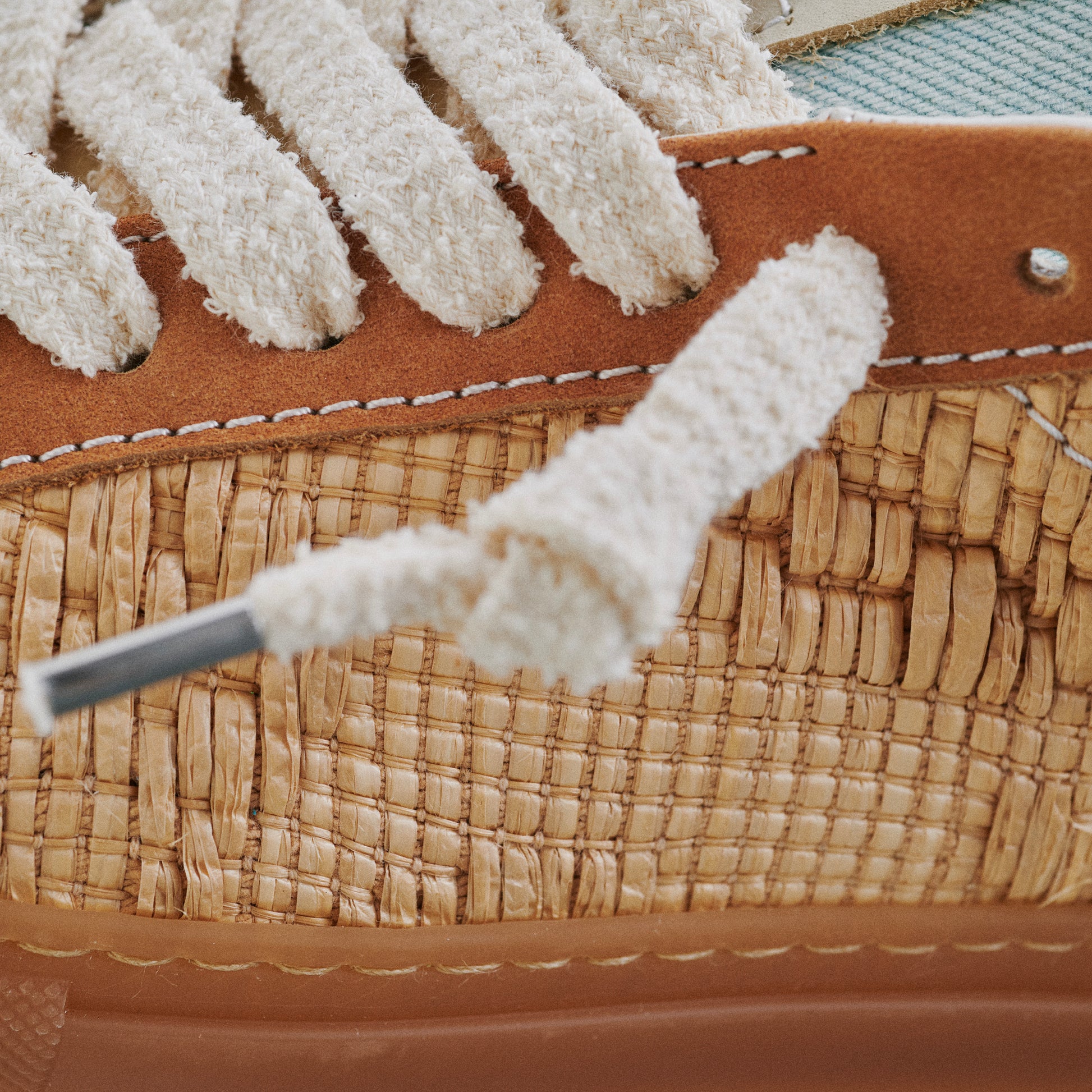 • Raffia and denim upper.