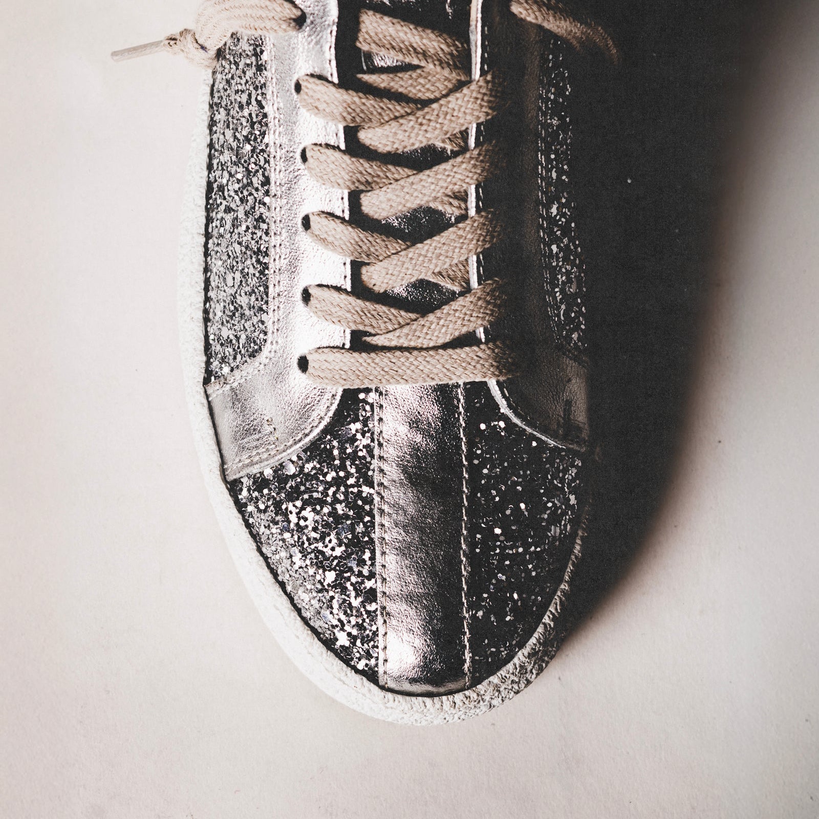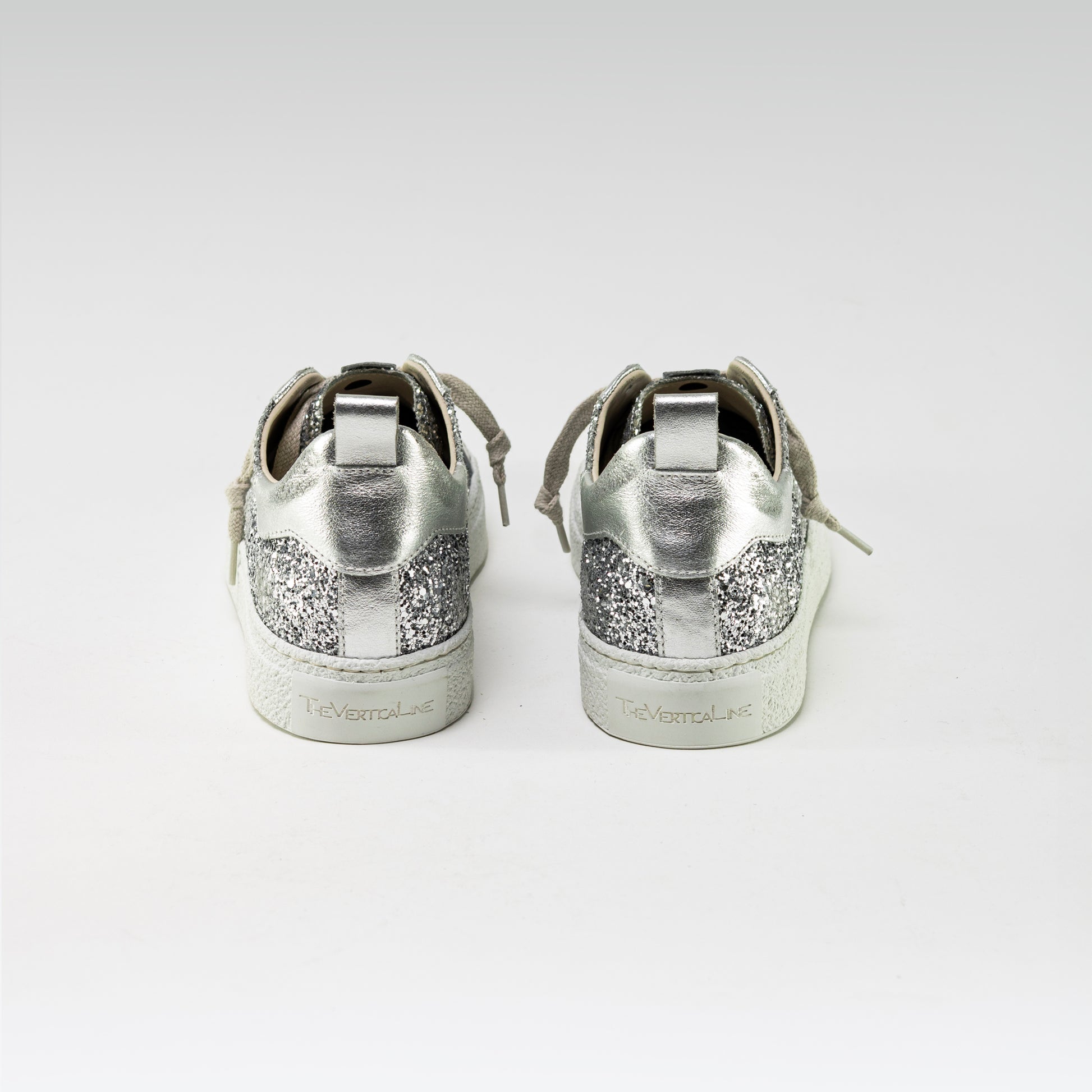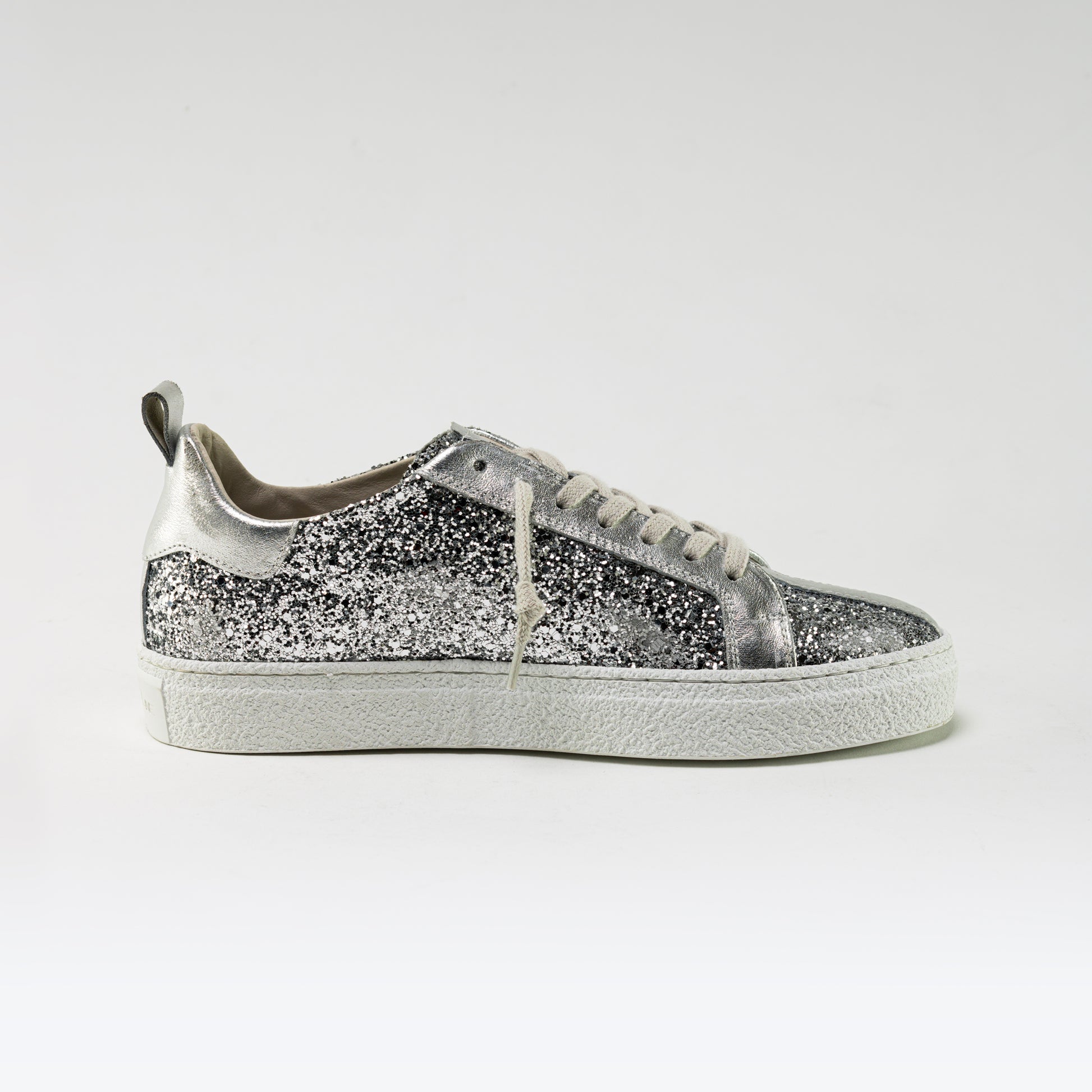 Unisex low-top sneaker with glitter upper and laminated calfskin trim, rubber sole, cotton laces, and genuine leather lining. Handmade in an Italian artisan workshop.