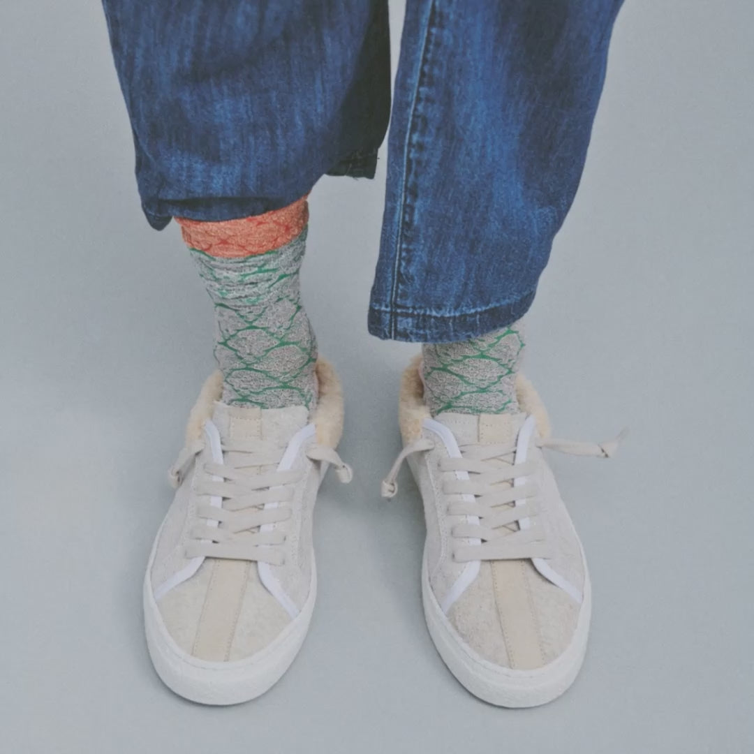 Mule unisexe avec tige en daim laminé doré effet loden, semelle en caoutchouc, lacets en coton crème, second lacet en coton gris clair et doublure en fausse fourrure. Fabriqué à la main dans un atelier artisanal italien.